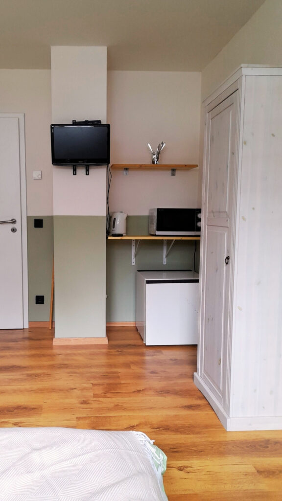 Die Ausstattung der Zimmer besteht aus einem Doppelbett 180×200 oder 160×200 sowie einem Esstisch mit zwei Stühlen, Kleiderschrank, und einem kleiner Bereich zur Selbstversorgung in welchem Du Deine Mahlzeiten zubereiten kannst.