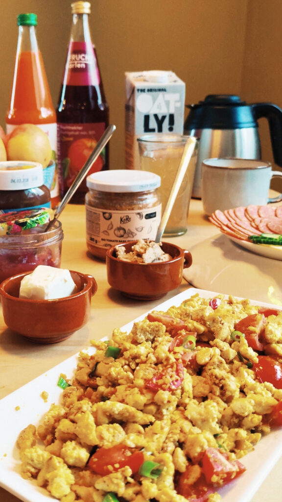 Wenn Du willst stellen wir Dir ein veganes Frühstück mit Tee, Kaffee, Saft, Hafermilch, veganer Butter, verschiedenen Aufstrichen, Vurst- sowie Käseersatz und jeden zweiten Tag deftiges Rührtofu und Ähnlichem zur Verfügung. Frisches, saisonales Obst oder Gemüse sowie Brötchen, Brot, Müsli und Frühstücksflocken bekommst Du ebenfalls von uns. Also lass es Dir schmecken.