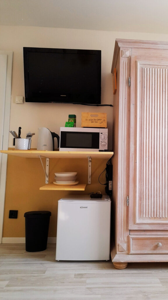 Du findest in jedem Zimmer einen Kühlschrank, eine Mikrowelle, Wasserkocher und nötiges Geschirr, Besteck, Flaschen- Dosenöffner usw. vor. Einen kleinen Vorrat an Teebeuten und Instantkaffee stellen wir Dir zu deiner Verpflegung bereit. Den Abwasch übernehmen gerne wir für Dich damit du Dich bei uns den Dingen zuwenden kannst die du gerne machst.